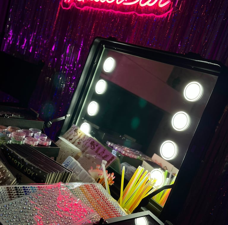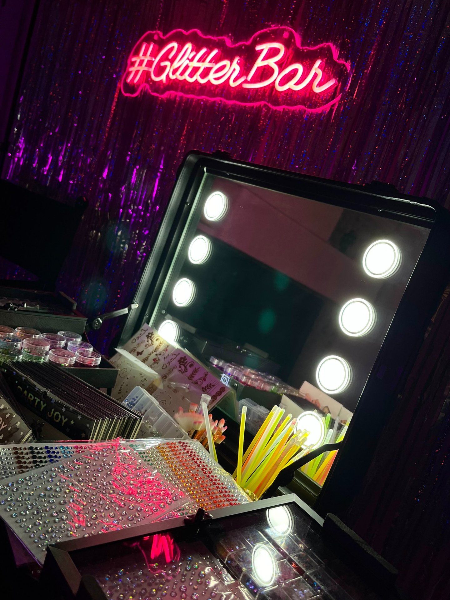 Ofrecemos un stand único con brillo, glitter y piedras decorativas para hacer relucir tu evento. Ofrecemos opción de maletín o mesa. Siempre te acompañaremos con nuestra maquilladora/as.